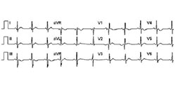 This child has atrial flutter, caused by an abnormal circuit of cells within the atrial tissue causing tachyarrhythmia. This child has 4:1 or 5:1 atrioventricular block. Beta-blockers can cause abolition of arrhythmias within the atrial or ventricular tissue. Agents which slow the atrioventricular nodal conduction (such as adenosine or Valsalva maneuver) will not abolish this arrhythmia, though they may slow the atrio-ventricular conduction. Lidocain affects ventricular tissue and has no effect on atrial tissue.